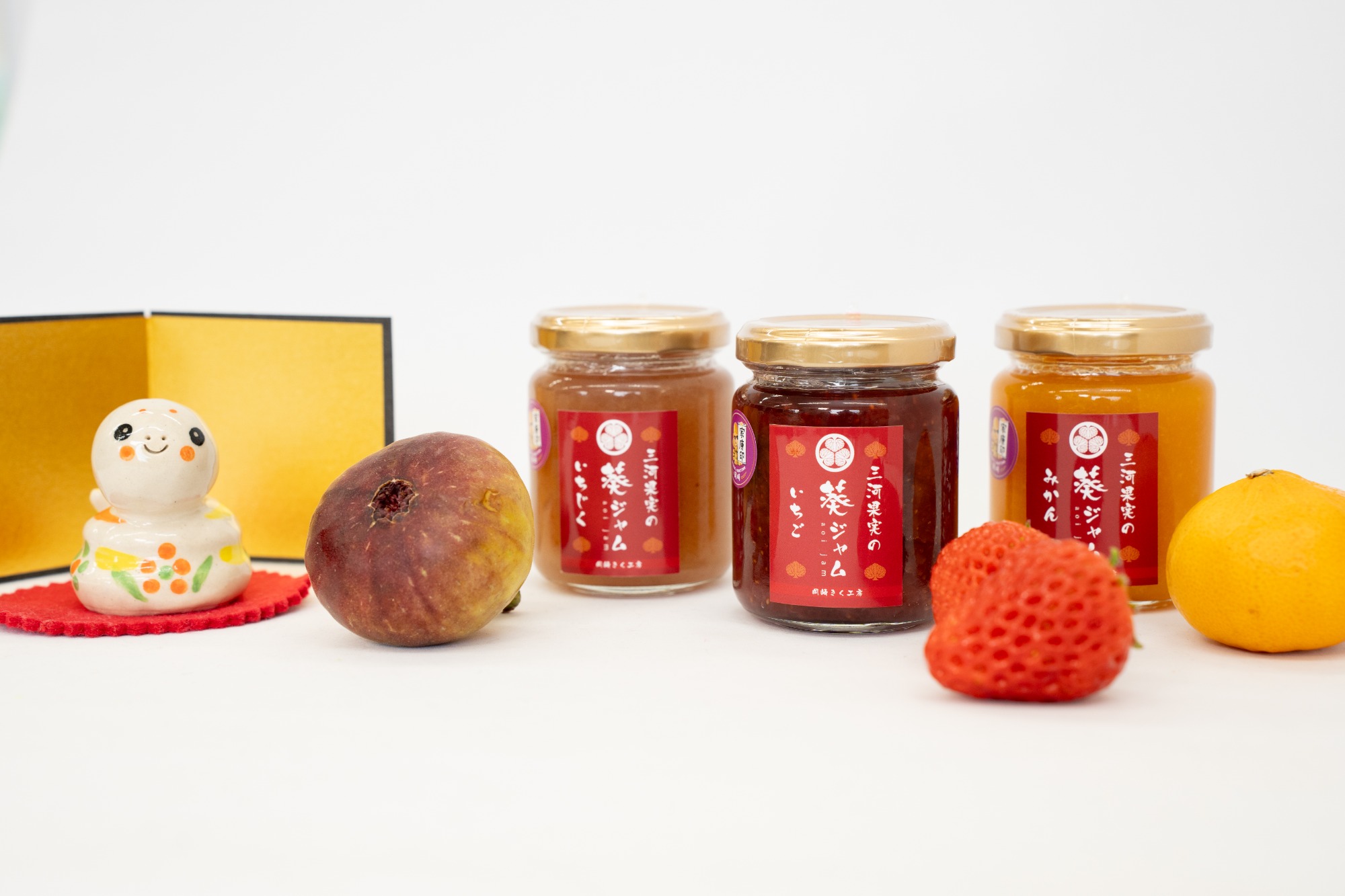こんにちは。 おかふる公認ライター、オカザキチューブの小野です。 今回は岡崎きく工房の出品商品「三河果実の葵ジャム3種と干支人形」についてご紹介します!三河果実の葵ジャムは、三河の農家さんの畑で摘んだ、旬の果実を使用したジャムです。 保存料や着色料は一切使わずに、果肉に砂糖とレモン果汁のみを加えた、果物本来の美味しさが味わえます。 果肉がゴロっと入っているので、果物感も楽しめますよ!工房で一つ一つ手づくりしたジャムは、パンやヨーグルトにもピッタリ♪ 砂糖は控えめで、果物の風味を活かしたやさしい甘さなので、紅茶に入れたり、チーズに乗せたり、カナッペとしていただくなど、アレンジレシピは無限大! 今回3種セットになった、いちご、みかん、いちじくは、それぞれ岡崎、蒲郡、幸田町と、三河で採れた果物ばかり。 地元の味を是非一度ご賞味ください!