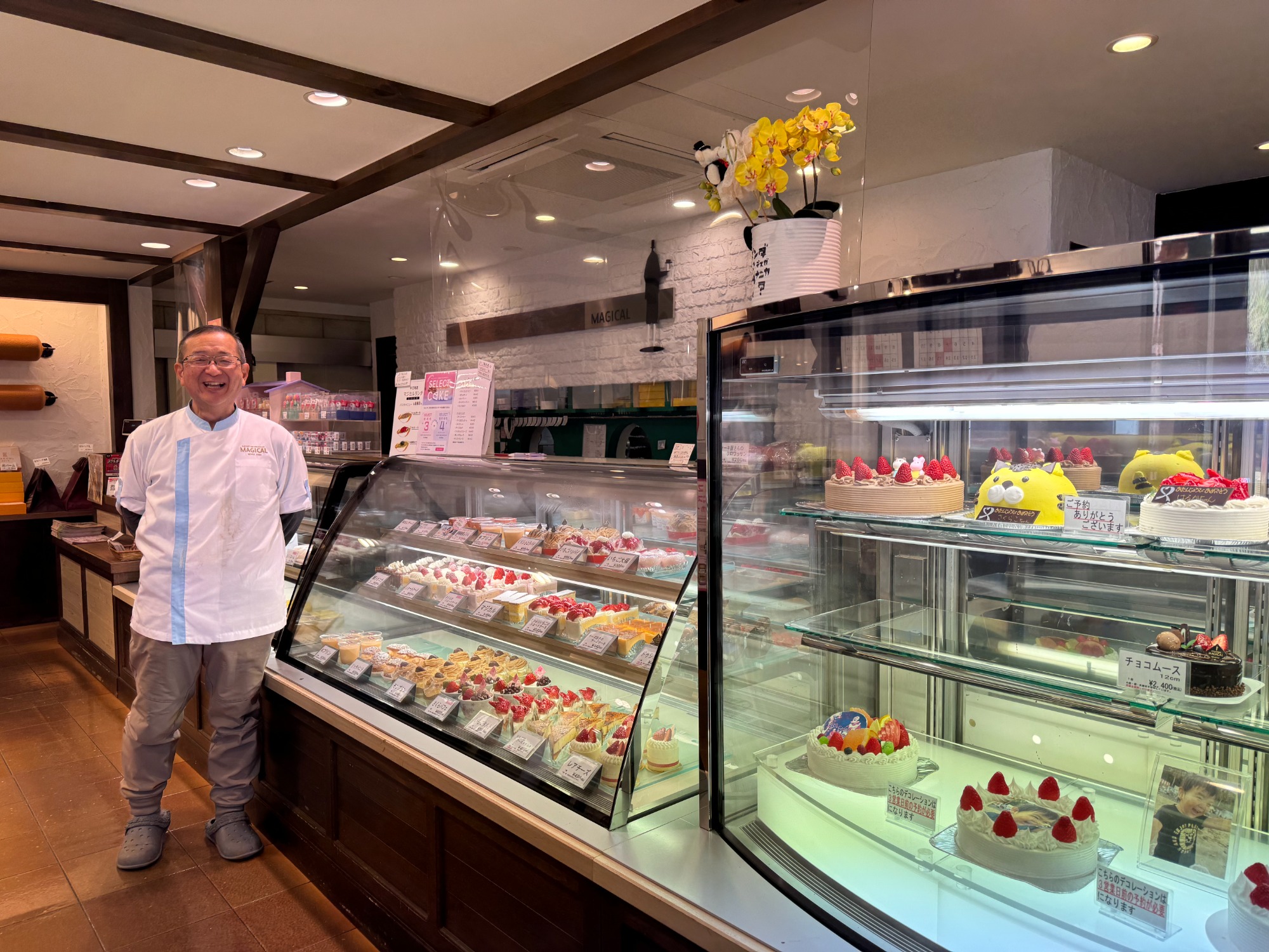 こんにちは。 おかふる公認ライター、おもしろ創造研究室 室長の岡田です。 今回は、岡崎市東部で製菓業・カフェを営むマジカルさんに取材に行ってきました。 マジカルさんは創業38年。 地元では知らない人がいない有名店であります。 私もそうだったのですが、この記事をご覧の皆様も一度はマジカルさんのケーキを食べたことがあるのではないでしょうか? そんなマジカルさんは、種類豊富なデコレーションケーキや、随時30種類ほどあるカットケーキをはじめとして、 さらには岡崎市の八丁味噌やえごま油、卵やいちごを使うなど地元を大切にした取り組みもされているのだとか! 今回取材に応じていただいたのは、代表取締役の尾崎さん。 早速お話を伺いましょう! 尾崎「元々、ケーキ作りを生業にしようとは考えていませんでした。 大学受験に失敗してしまい、将来のことを考えた時に『地元で商売をしたい』という気持ちが芽生えました。 その時にはふんわりと地元で喫茶店を開業したいと考えていたので、大阪の調理師学校へ進学しました。 必修科目に加えて、選択科目が選べたので、喫茶店開業に役立つだろうと「喫茶・バーテンダー」と「洋菓子」の2科目を選びました。 卒業後は豊橋にあるマッターホーンという洋菓子専門店に就職、3年間修行をしていました。 マッターホーンは洋菓子販売と喫茶が併設されていたので、そこでの経験が今に活きています。そして、岡崎市に戻ってきてすぐに『マジカル』をオープンしました。 当時23歳でしたから、独立するには早いのでは?と周りから言われました。 今となっては恥ずかしい話なのですが、高校の同級生が大学を卒業して、社会人1年目を迎えるタイミングで私は社長になってやる! という反骨精神というか、負けず嫌いなところがあって笑 23歳というとかなり若かったかと思いますが開店してしまいました。 若さとは勢いですね。」 高校を卒業してから、しっかりと自分の将来を考えて行動されていらっしゃったのですね。 私も尾崎さんの同級生同様、大学では勉学よりも遊んでいる時間の方が多かった気がするので、背筋が伸びる思いです。 それでは、私が『マジカル』さんに取材が決まってから、一番聞いてみたかったことを聞いてみたいと思います。 尾崎「一言で言えば、『手品のように、魔法のように美味しいケーキを作りたい』ということですね。 開店した当時は、『マジカル』という言葉の認知度は今よりも低く、その後「マジカル頭脳パワー」や「まじかる☆タルるートくん」の影響で一般の方が知るようになった気がしています。」