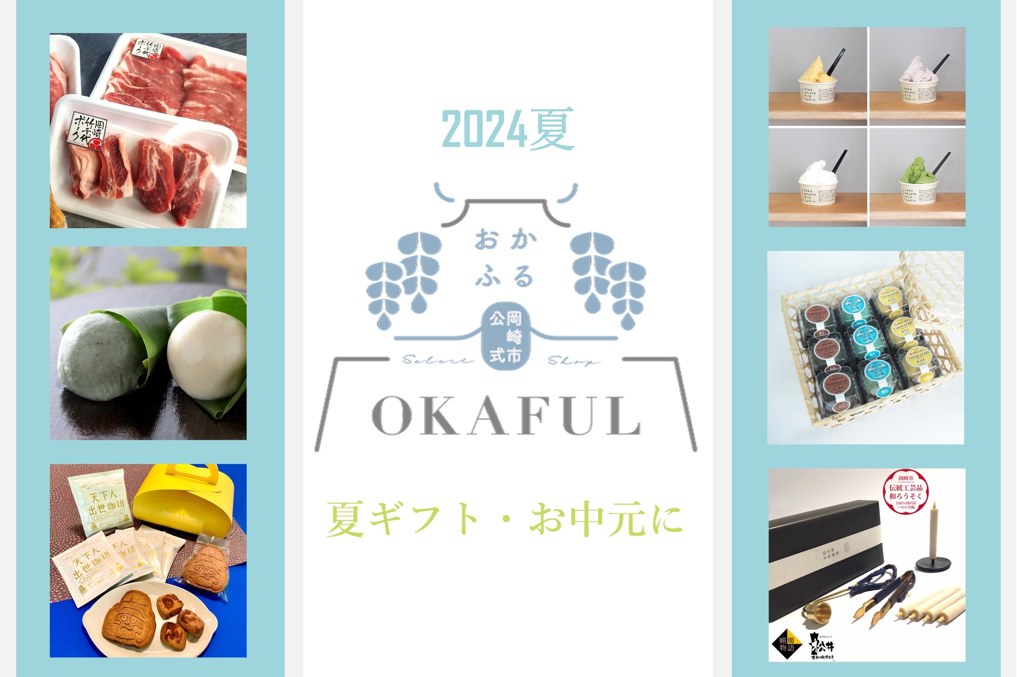 2024年、夏がやってきました!新商品がたくさん登場です! 夏らしい商品から伝統工芸品まで、プレゼントにピッタリなものをラインアップ。 夏ギフトやお中元で何を贈ろうか迷っているかた、「岡崎産」の商品から選んでみませんか。 まずは、今回おかふるの仲間になった3店舗からご紹介!岡崎・康生エリアにオープンした『愛知県の果物や野菜の作り手の顔がみえるジェラート屋』のジェラートがおかふるに登場! 数ある中から、オーカジェラートがおすすめしたいジェラートをご用意しました。 おすすめのジェラート6個セット、ぜひおうちで食べてみてください! ■価格 3,300円(税込)+送料[60サイズ(クール)]「岡崎竹千代ポーク」、「みかわもち豚」、「三州牛」、「みかわ牛」など、三河・岡崎の高品質な銘柄肉を専門とする食肉加工・販売を行う株式会社深瀬畜産さんから、とっておきのお肉のご出品! 岡崎生まれ岡崎育ちの三元豚、岡崎竹千代ポークを使用した焼肉用の盛り合わせです。この夏のバーベキュー、岡崎のお肉をつかってみませんか。 ■価格 3,000円(税込)+送料[80サイズ(クール)]